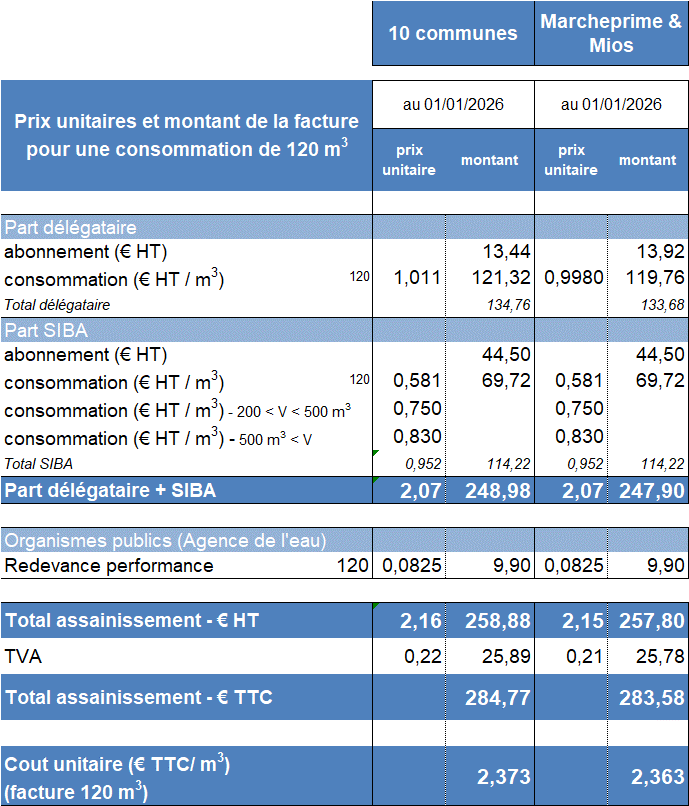 Depuis le 1er janvier 2020, le SIBA a élargi son territoire aux communes de Mios et de Marcheprime, dont l'exploitation des ouvrages fait l'objet d'une délégation de service public spécifique. La part délégataire de la redevance assainissement diffère ainsi entre ces deux communes et le reste du territoire. La part SIBA de la redevance assainissement est identique pour l'ensemble des 12 communes.