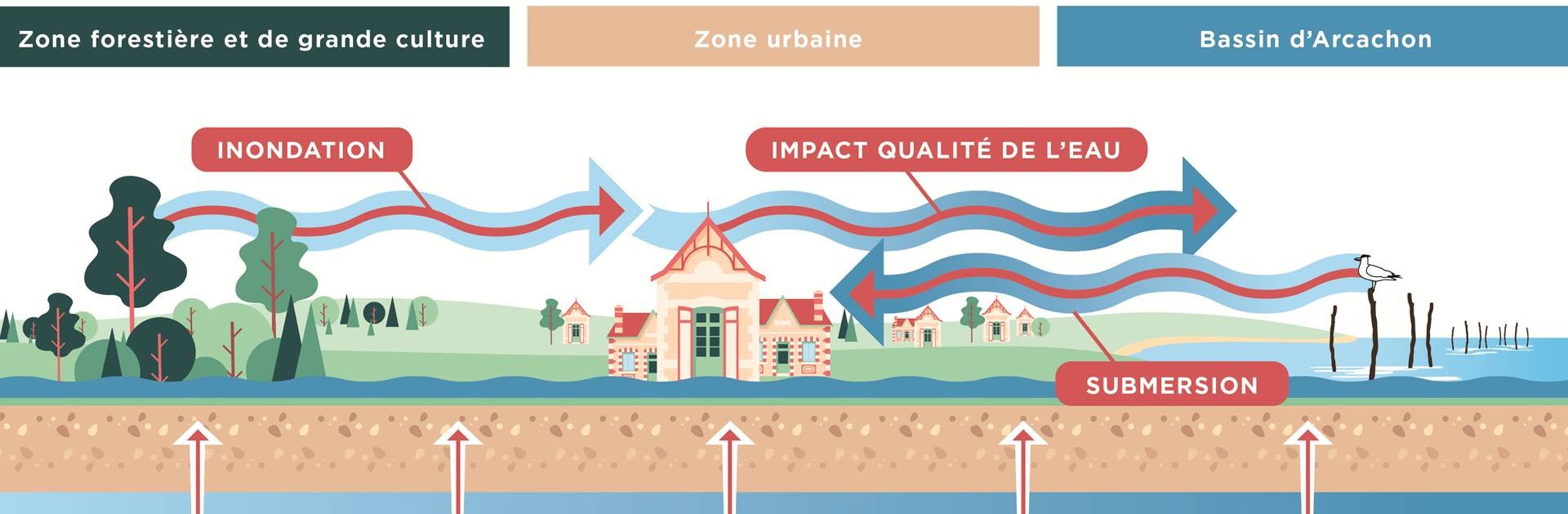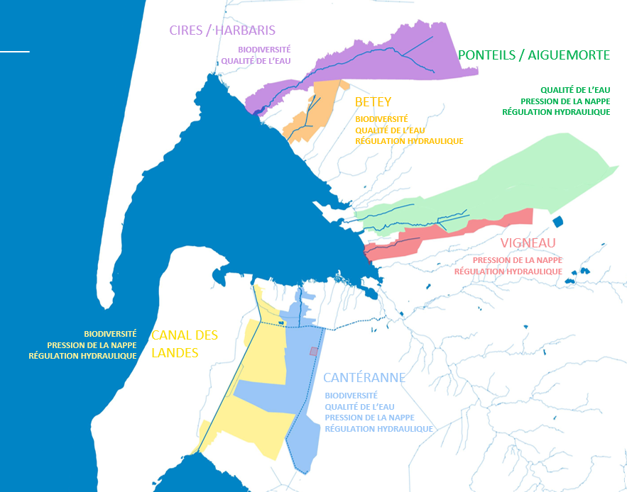 Ce vaste projet se déploie en partenariat notamment avec la Fédération Départementale des Associations Agréées de Pêche et de Protection du Milieu Aquatique de Gironde (FDAAPPMA), la Défense de la Forêt Contre les Incendies de Gironde (DFCI), le Parc Naturel Régional des Landes de Gascogne (PNRLG), l'association Cistude Nature, la commune d'Andernos-les-Bains et le Groupement de Recherche sur les Cultures et Techniques Agricoles des Sols Forestiers d'Aquitaine (GRCETA.SFA), les forestiers, dont la Caisse des Dépôts et Consignations, la compagnie forestière, et les agriculteurs.